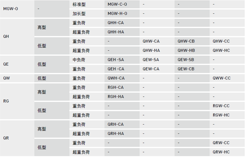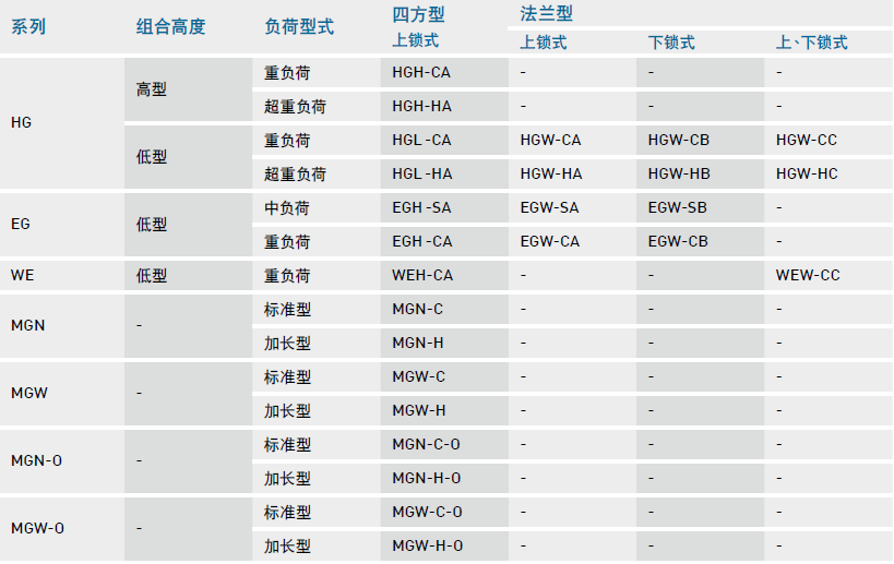 為服務(wù)客戶因應(yīng)其對(duì)產(chǎn)品多樣性的需求,除了適用一般工具機(jī)產(chǎn)業(yè)的HG系列外,更研究開發(fā)出較適合自動(dòng)化產(chǎn)業(yè)的EG系列以及適合于單軸設(shè)備使用的WE/QW系列;且研究開發(fā)出適合高剛性需求產(chǎn)業(yè)的RG/QR系列及微小型機(jī)械半導(dǎo)體產(chǎn)業(yè)適用之MGN/MGW系列;并針對(duì)高科技產(chǎn)業(yè)研究開發(fā)出具有高速、寧?kù)o、低發(fā)塵需求的QH/QE系列產(chǎn)品。