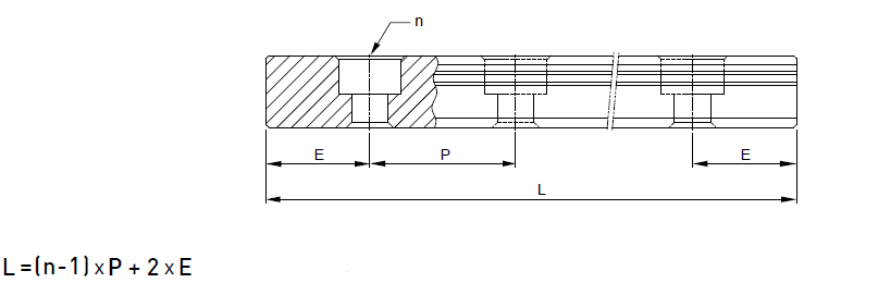 備有導軌標準長度庫存,以供應客戶需求。若客戶訂購非標準長度導軌時,端面距離E的尺寸,最好不要大于1/2P,防止因E的尺寸過大,導致導軌裝配后端部的不穩定,而降低直線導軌的精度,亦不可取用過小的E值 (小于Emin)以避免螺栓孔破孔。